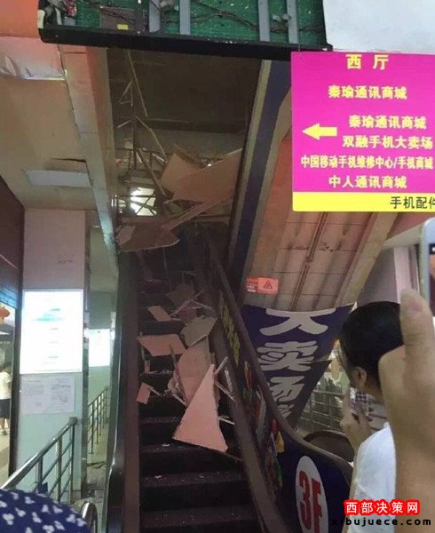 (通訊員 展?。?nbsp;今天中午1點左右,西安市西華門海星智能廣場四樓賣場電梯頂?shù)蹴斖蝗幻撀?。商戶們說,房頂是木質(zhì)結(jié)構(gòu),坍塌毫無預兆。事故所幸暫時沒有人員受傷!