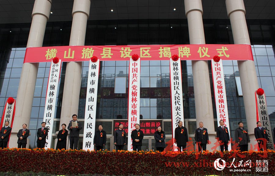 11月9日上午,橫山撤縣設區(qū)黨政干部大會暨揭牌儀式在橫山舉行。榆林市委書記胡志強,市長尉俊東,市政協(xié)主席劉春橋,陜西省民政廳副廳長郭慧敏等出席掛牌儀式。中國共產(chǎn)黨榆林市橫山區(qū)委員會、榆林市橫山區(qū)人民政府正式掛牌。未來,榆林市行政區(qū)劃將變?yōu)?區(qū)10縣。