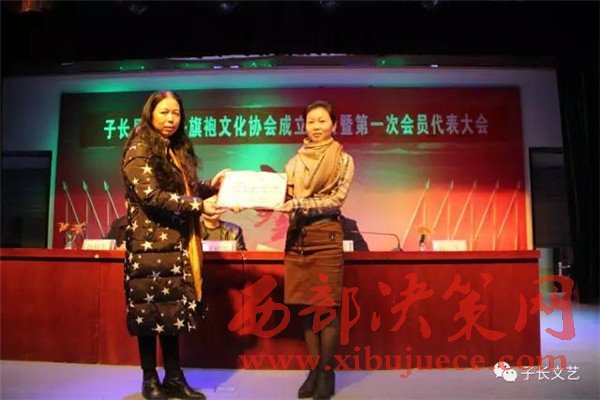 在會上,山丹丹旗袍文化協(xié)會的負(fù)責(zé)人白潔做了協(xié)會前期籌備工作的簡述,文廣局副局長宣讀了同意子長縣山丹丹旗袍文化協(xié)會成立的批復(fù);民政局副局長趙和平頒發(fā)社會團體登記證。會中還進行了對協(xié)會的理事會,監(jiān)事會,主席團成員的選舉。當(dāng)選為協(xié)會主席的白潔在會上做了表態(tài)發(fā)言,并代表協(xié)會向協(xié)會的顧問李建中、王明如,名譽主席王晶、張琴頒發(fā)了聘書。最后,協(xié)會會員還為觀眾們準(zhǔn)備了一道文藝表演的盛宴,大會在星光大道歌手孫秸的一曲《山丹丹開花紅艷艷》中勝利中閉幕。