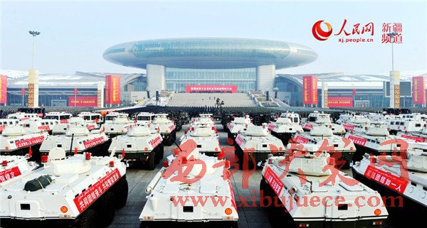 新疆國際會(huì)展中心廣場(chǎng)上,1萬余名武警官兵、公安民警、民兵預(yù)備役人員等各維穩(wěn)力量緊握鋼槍盾牌、整齊列隊(duì)挺立,直升機(jī)在空中盤旋,一輛輛軍車、裝甲車、摩托車列隊(duì)待發(fā)。