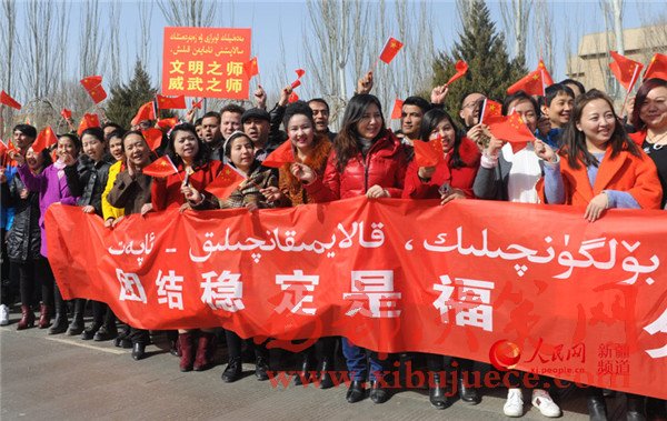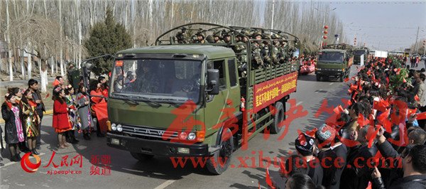 喀什市民在道路兩旁歡迎參加反恐維穩(wěn)誓師大會(huì)的武警官兵。