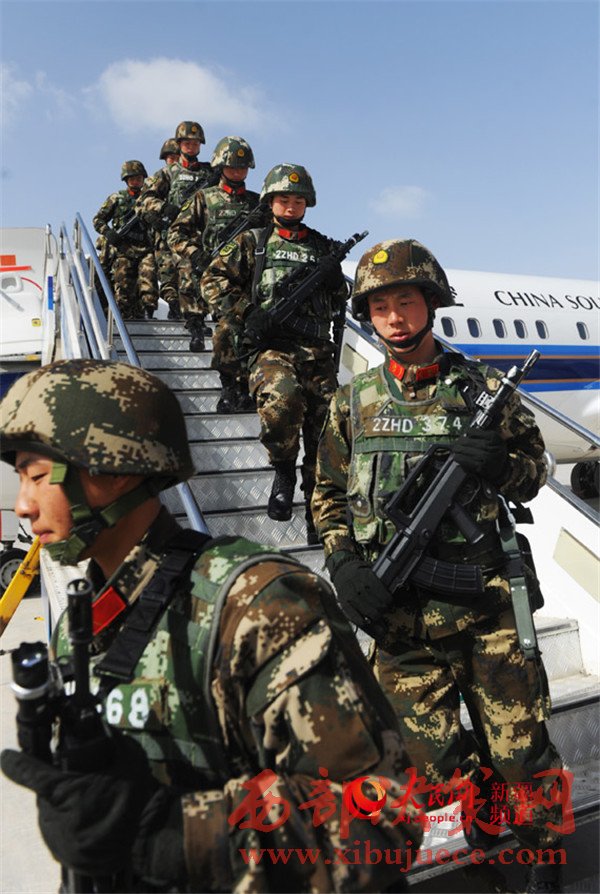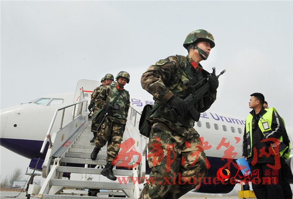 參加反恐維穩(wěn)誓師大會(huì)的武警官兵到達(dá)喀什機(jī)場(chǎng),向任務(wù)區(qū)進(jìn)發(fā)。