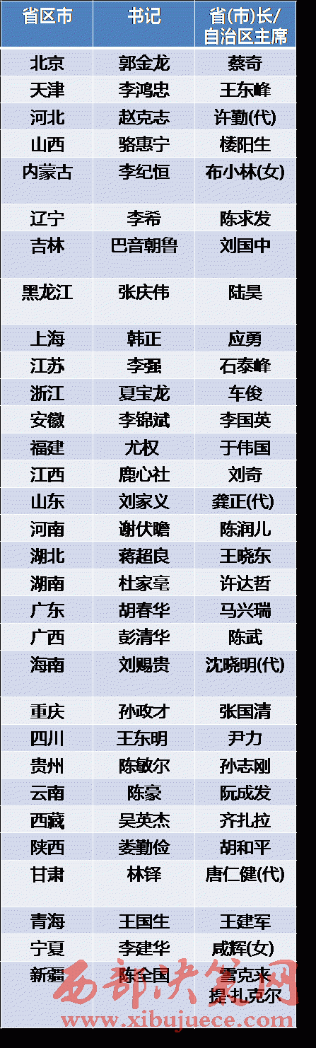 全國31省區(qū)市現(xiàn)任黨政“一把手”名單