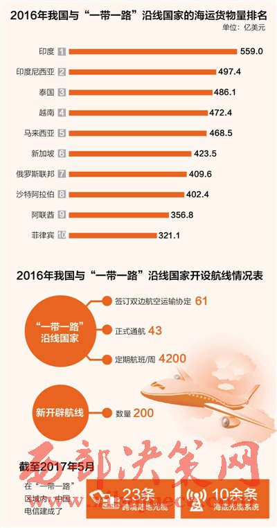 據(jù)統(tǒng)計,通過73個公路和水路口岸,中國與相關(guān)國家開通了356條國際道路客貨運輸線路;海上運輸服務(wù)已覆蓋“一帶一路”沿線所有國家;與43個沿線國家實現(xiàn)空中直航,每周約4200個航班;簡化了國際鐵路聯(lián)運辦理手續(xù),促進(jìn)中歐間國際鐵路貨物聯(lián)運,開展國際鐵路運郵合作。