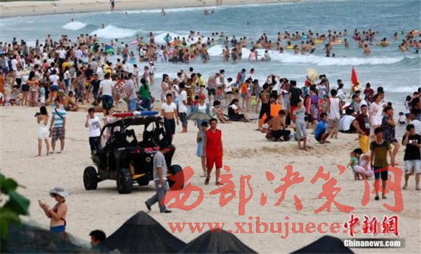 資料圖:2016年6月9日,海南三亞,大批當?shù)厥忻窈陀慰驮诖髺|海海灘扎堆“洗龍水”過端午節(jié)。