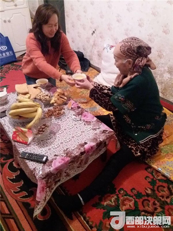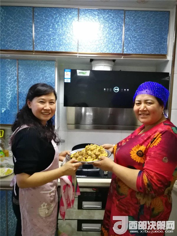 艾來提·賽買提的父親賽買提·阿合買提一面接過韓莉書記手里的米、面、清油和兩大兜食材,一面心疼地埋怨:“這么冷的天,你們又拿這么多東西,多辛苦,你上次送來的東西還沒有吃完呢。”韓莉和王艷萍笑而不語(yǔ),心里默默地盤算著帶給親戚意外的驚喜。因?yàn)榘瑏硖?middot;賽買提和愛人長(zhǎng)期兩地分居,聚少離多。今天正好是他們父母結(jié)婚三十周年紀(jì)念日,她們?nèi)嗽缇蜕塘亢靡欢ㄒH手做一頓飯,邀請(qǐng)這個(gè)民族團(tuán)結(jié)大院里附近的同事和各自的親戚一起來給這個(gè)小家庭舉辦一場(chǎng)別開生面的大融合聚會(huì),她們忙碌著,擇、洗、炒,撲鼻的香味彌漫在親戚的家中……