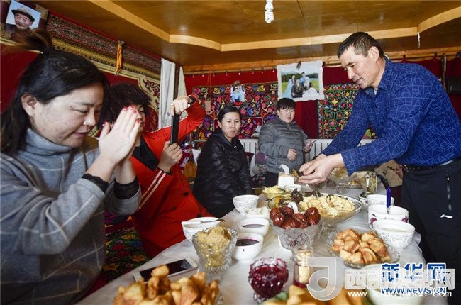 在喀納斯禾木村美麗峰腳下的“迪娜小屋”里,男主人奇肯讓游客品嘗哈薩克族美食——馬肉納仁(1月2日攝)。記者 趙戈 攝