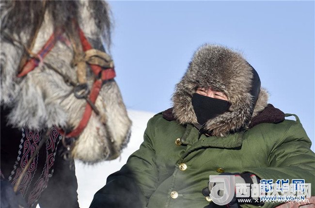 在最低溫度接近零下40攝氏度的新疆喀納斯禾木村,一位居民身穿厚厚的衣服坐在爬犁上(1月1日攝)。記者 趙戈 攝