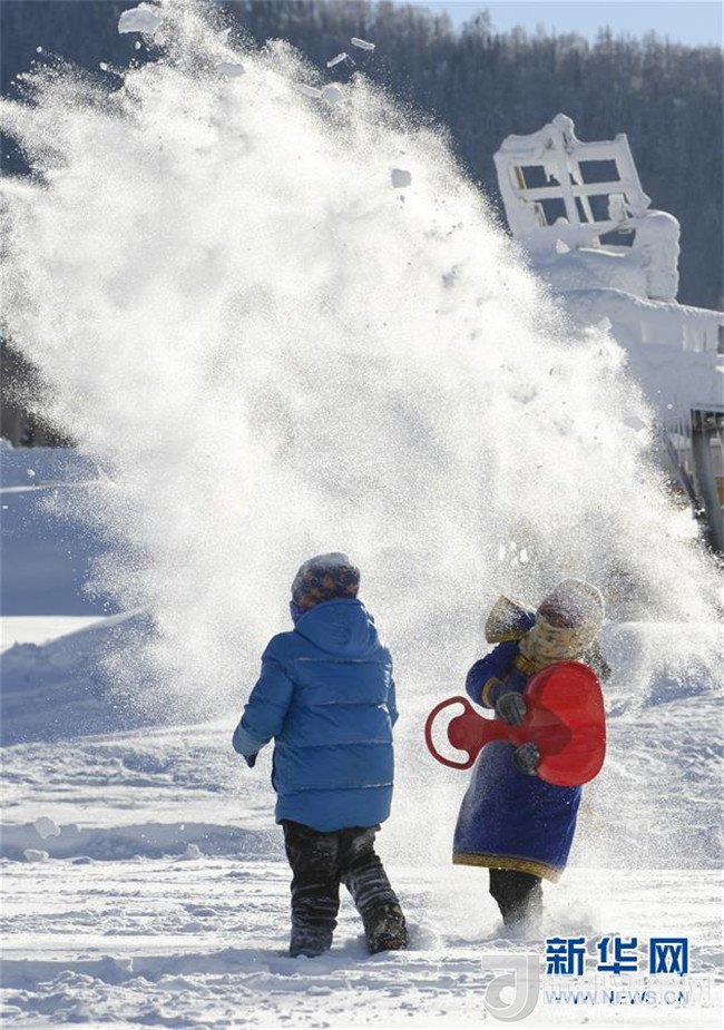 在新疆喀納斯禾木村舉辦的潑雪節(jié)上,游客潑雪慶祝新年(1月1日攝)。記者 趙戈 攝