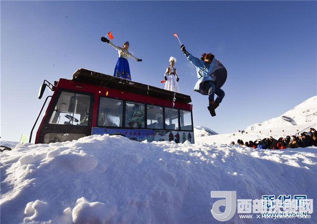 在新疆喀納斯禾木村舉辦的潑雪節(jié)上,當(dāng)?shù)鼐用裨跒橛慰捅硌萏?月1日攝)。記者 趙戈 攝