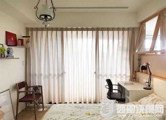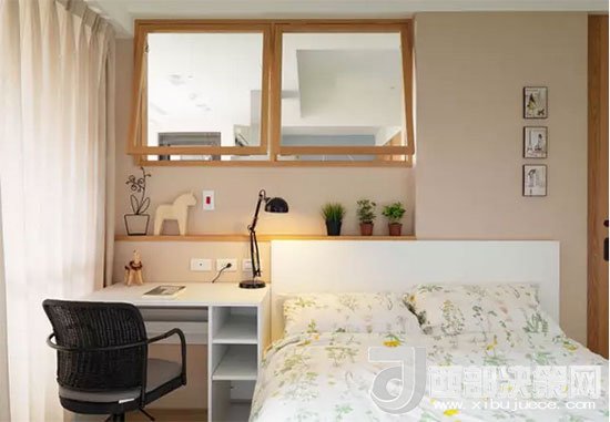 寫字臺(tái)緊靠床邊,發(fā)揮了床頭柜的功能,臺(tái)燈也可以當(dāng)做床頭燈,減少不必要的裝飾。房主人利用凹進(jìn)去的墻面正好做了一個(gè)擱物臺(tái),放上幾盆綠植,伴著自己入眠。