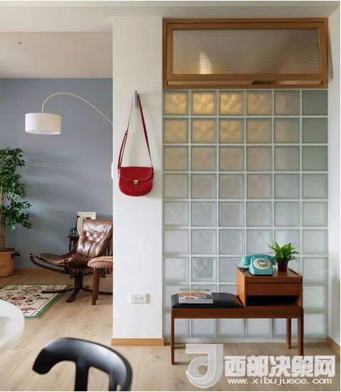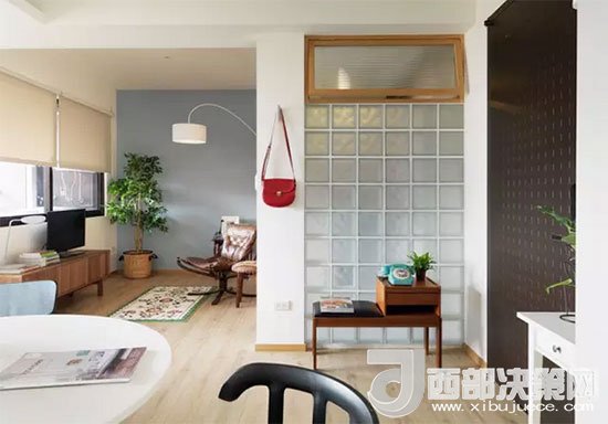 客廳的前方是隔開的陽(yáng)臺(tái),背面則是衛(wèi)浴室,一處墻面用玻璃磚代替,增加了衛(wèi)浴室的采光,和白色墻面比起來更顯通透。