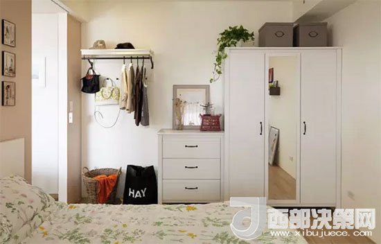 藤筐、收納箱、掛衣桿、衣柜,各種收納工具一應(yīng)俱全,搭配得十分得宜。衣柜中間柜門上安裝了全身鏡。對(duì)于不愿把鏡子放進(jìn)臥室的房友們來說,不知道這樣子布置會(huì)不會(huì)稍好一些。
