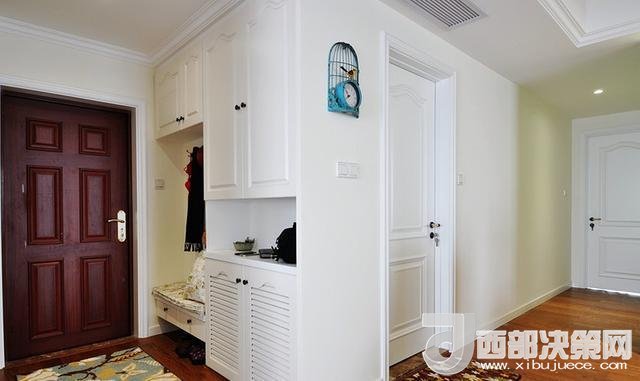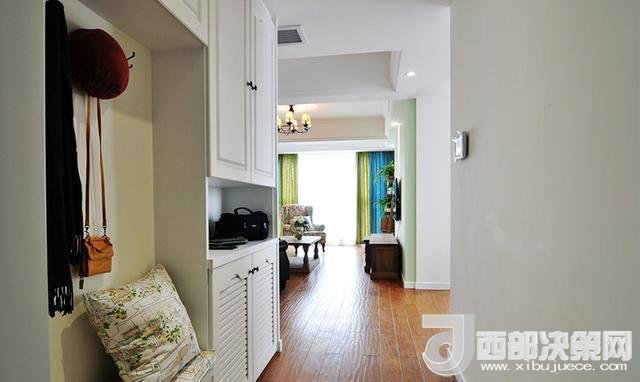 進門玄關(guān),貼壁做了一排的櫥柜,模仿國外家居設(shè)計,做了一個連體的矮柜換鞋凳,上方安裝掛鉤吊衣服。