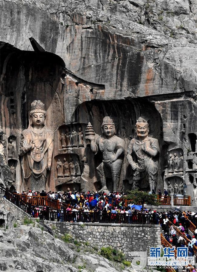 4月11日,游客在河南洛陽龍門石窟景區(qū)參觀游覽。