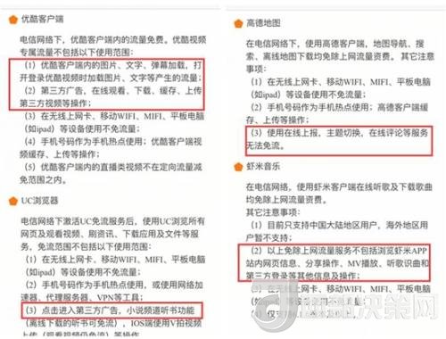 以優(yōu)酷和中國電信合作的“大小魚卡”為例,其說明顯示,“優(yōu)酷視頻專屬流量不包括優(yōu)酷客戶端內(nèi)圖片、文字、彈幕加載、打開優(yōu)酷視頻時加載圖片、文字等產(chǎn)生的流量。”當(dāng)然,第三方廣告也不在內(nèi)。