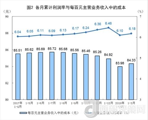 1-3月份,規(guī)模以上工業(yè)企業(yè)實(shí)現(xiàn)主營(yíng)業(yè)務(wù)收入25.2萬億元,同比增長(zhǎng)9.6%;發(fā)生主營(yíng)業(yè)務(wù)成本21.2萬億元,增長(zhǎng)9.4%;主營(yíng)業(yè)務(wù)收入利潤(rùn)率為6.18%,同比提高0.11個(gè)百分點(diǎn)。