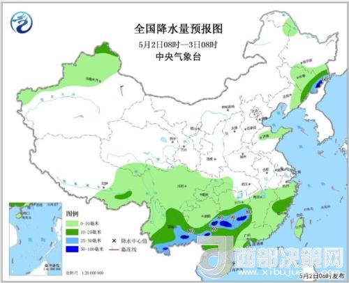 5月3日08時至4日08時,東北地區(qū)東北部、華南大部、貴州中南部、云南中東部等地有中到大雨,其中,廣東南部、廣西西部、云南東南部等的部分地區(qū)有暴雨,局地大暴雨(100~110毫米);上述局部地區(qū)將伴有短時強降水等強對流天氣。新疆南疆盆地、內蒙古中西部、西北地區(qū)東北部、華北北部、黃淮東部、江淮東部等地的部分地區(qū)有4~6級風;新疆南疆盆地等地的部分地區(qū)有揚沙或浮塵天氣(見圖2)。