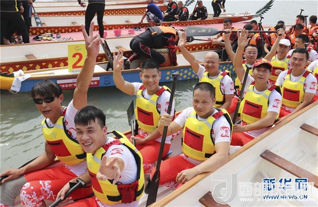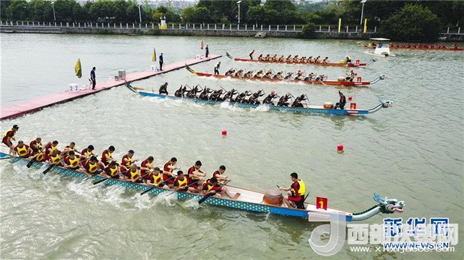 5月26日,參賽龍舟在浙江省溫州市會昌湖水面上比拼。當(dāng)日,浙江溫州第五屆龍舟聯(lián)賽的一場比賽在會昌湖水上公園龍舟基地舉行。眾多龍舟同場競技,上演了精彩的水上比拼。新華社發(fā)(蘇巧將攝)
