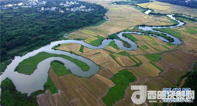 空中俯瞰??谑协偵絽^(qū)曲溪濕地(5月30日無人機拍攝)。