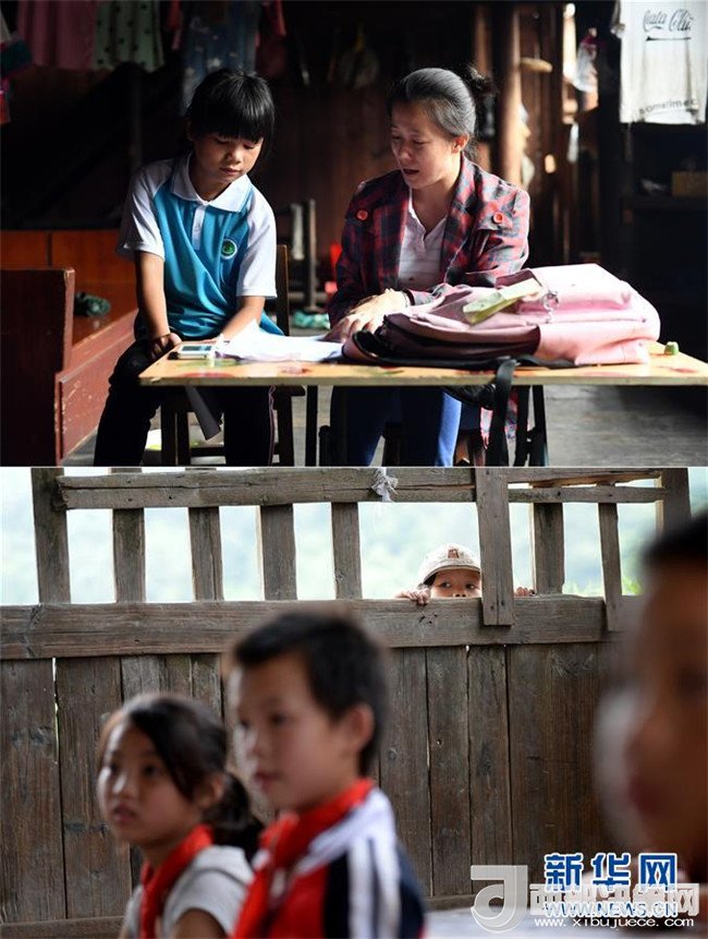 這是一張拼版圖片。上圖為2018年5月31日,在廣西三江侗族自治縣安馬村寨全屯,駐村工作隊員唐莉越入戶給10歲的彭桂花(左)輔導(dǎo)功課;下圖為2014年6月10日,即將入學(xué)的彭桂花在寨全教學(xué)點的吊腳樓教室外張望。