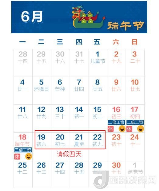 今年端午節(jié)放假時(shí)間為6月16日至18日,共計(jì)3天。中新經(jīng)緯客戶端注意到,只要能在19日-22日請(qǐng)假4天,端午節(jié)便可連休9天。