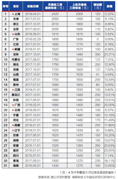 根據(jù)圖表可以看出,安徽和四川兩省調(diào)整最低工資標(biāo)準(zhǔn)最近的日期均是2015年。不過(guò)目前這兩個(gè)省均已表態(tài)2018年將調(diào)整最低工資標(biāo)準(zhǔn)。