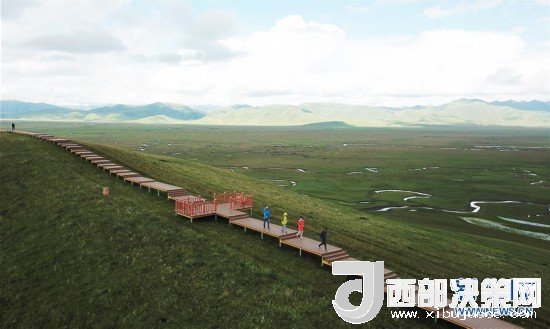 游客在瑪曲縣阿萬(wàn)倉(cāng)濕地的觀景步道上游覽(7月31日無(wú)人機(jī)拍攝)。新華社記者 陳斌 攝