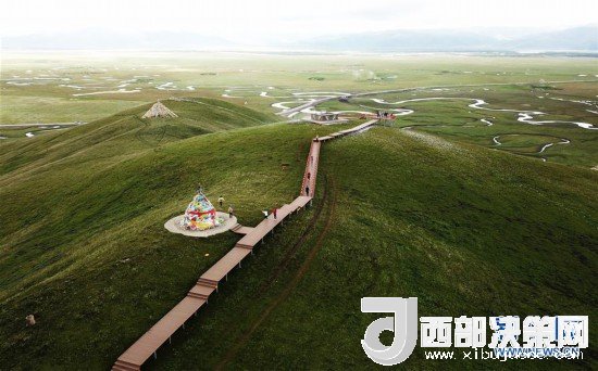 游客在瑪曲縣阿萬(wàn)倉(cāng)濕地的觀景步道上游覽(7月31日無(wú)人機(jī)拍攝)。 新華社記者 陳斌 攝