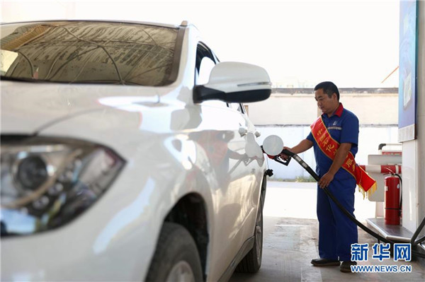 9月3日,河北省任縣一家加油站工作人員給車輛加油。 當日,國家發(fā)展改革委發(fā)布消息,按照現行成品油價格形成機制,自2018年9月3日24時起,國內汽油、柴油價格每噸分別上調180元和170元。 新華社發(fā)(宋杰 攝)
