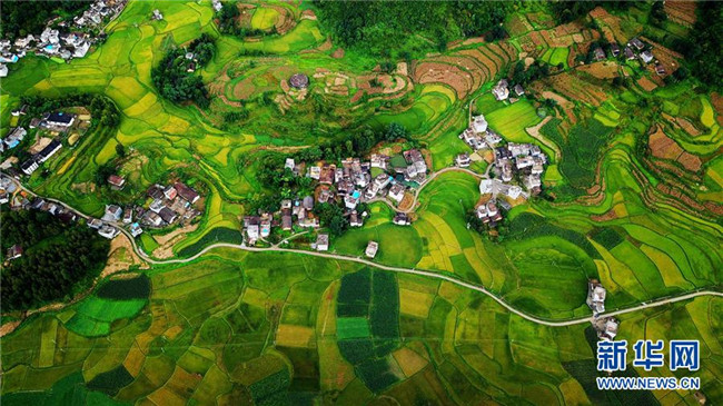 廣西隆林各族自治縣克長(zhǎng)鄉(xiāng)海長(zhǎng)村的秋稻即將成熟(9月1日無人機(jī)拍攝)。 新華社記者張愛林?jǐn)z