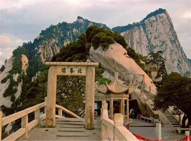 西峰海拔2082.6米,華山主峰之一,因位置居西得名。又因峰巔有巨石形狀好似蓮花瓣,古代文人多稱其為蓮花峰、芙蓉峰。袁宏道在他的《華山》中記述:“石葉上覆而橫裂”;徐霞客《游太華山日記》中也記述:“峰上石聳起,有石片覆其上,如荷花。”李白詩中有“石作蓮花云作臺(tái)”句,也當(dāng)指此石。