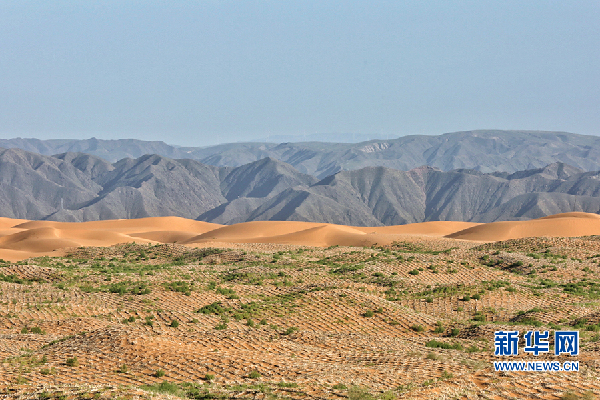 通過“麥草方格”模式組成的“沙帳植物帶”。新華網(wǎng)陳延特?cái)z