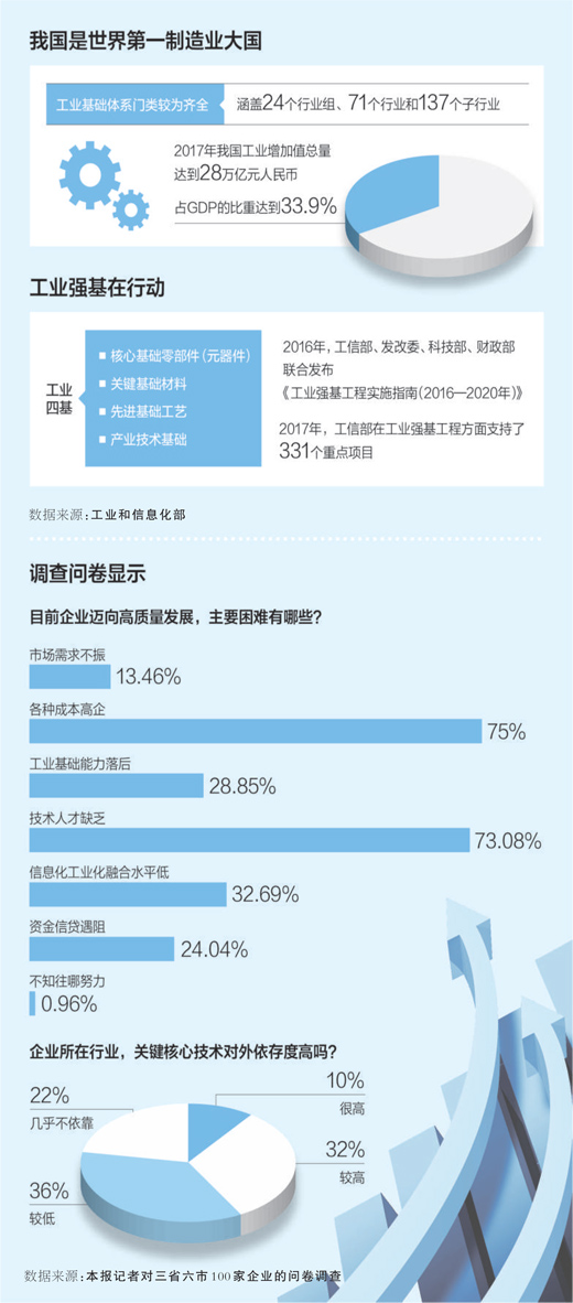 “要實現(xiàn)從‘有’到‘好’的轉變,在高端產(chǎn)品上突破,還需要時間。”調(diào)查中企業(yè)坦言,我國部分核心技術、關鍵產(chǎn)品和重大裝備仍存瓶頸制約,一些工業(yè)產(chǎn)品在一致性、穩(wěn)定性和使用壽命方面與國外先進水平差距較大,工業(yè)基礎須進一步夯實。