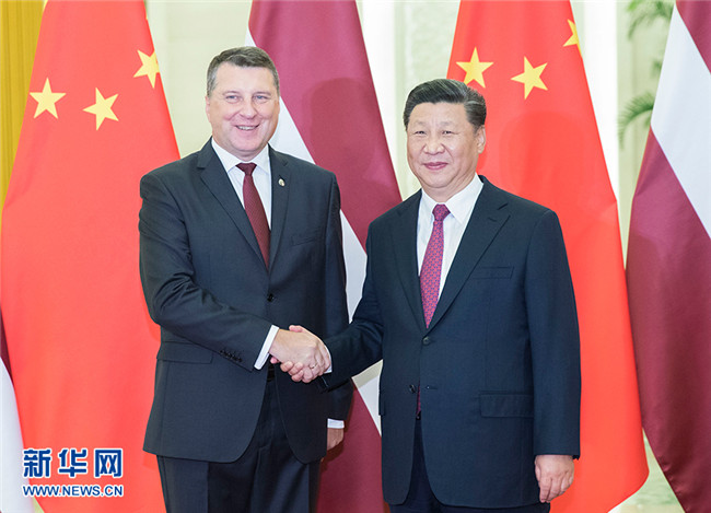 國(guó)家主席習(xí)近平18日在人民大會(huì)堂會(huì)見(jiàn)來(lái)華出席夏季達(dá)沃斯論壇的拉脫維亞總統(tǒng)韋約尼斯。