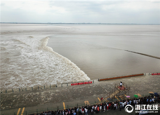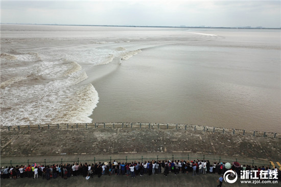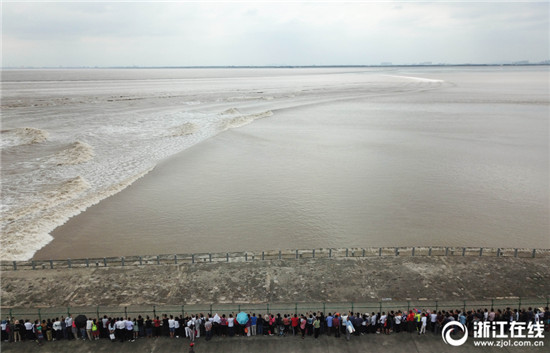 9月26日,農(nóng)歷八月十七,海寧大缺口觀潮點,千名游客在江堤上安全觀潮。據(jù)海寧鹽官水文站預(yù)測,從當天開始,錢塘江進入最佳觀潮期,預(yù)計八月十八大潮日,潮高會在1.5米左右。(浙江在線記者 董旭明 攝)