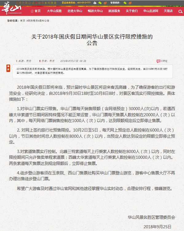 關(guān)于2018年國慶假日期間華山景區(qū)實行限控措施的公告
