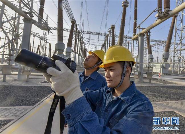 在吐魯番市750千伏變電站,兩位工作人員利用專(zhuān)用設(shè)備對(duì)電力設(shè)施進(jìn)行檢查(9月18日攝)。記者趙戈 攝