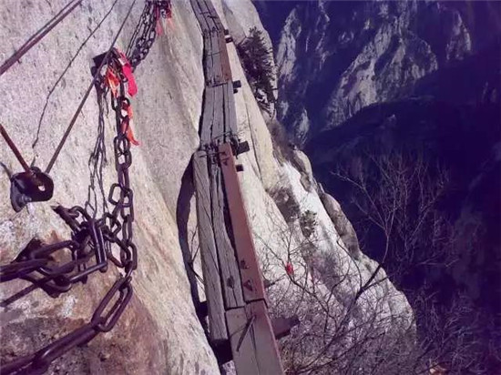 金鎖關(guān):到達(dá)金鎖關(guān)時(shí),眼前大片大片的紅色,游人的視覺和心靈受到強(qiáng)烈的沖擊。這是沿路兩邊鐵鏈上綁滿的密密麻麻的紅色絲繩,不留一絲空隙,風(fēng)吹來(lái),長(zhǎng)長(zhǎng)的紅色絲繩就輕盈的舞起來(lái),如愛情牢固的臂膀,甜蜜的飛翔在華山之上。讓一把感情鎖和華山一同到地老天荒,成為一個(gè)“山無(wú)陵,天地絕,乃敢與君絕”的千古情愛神話。