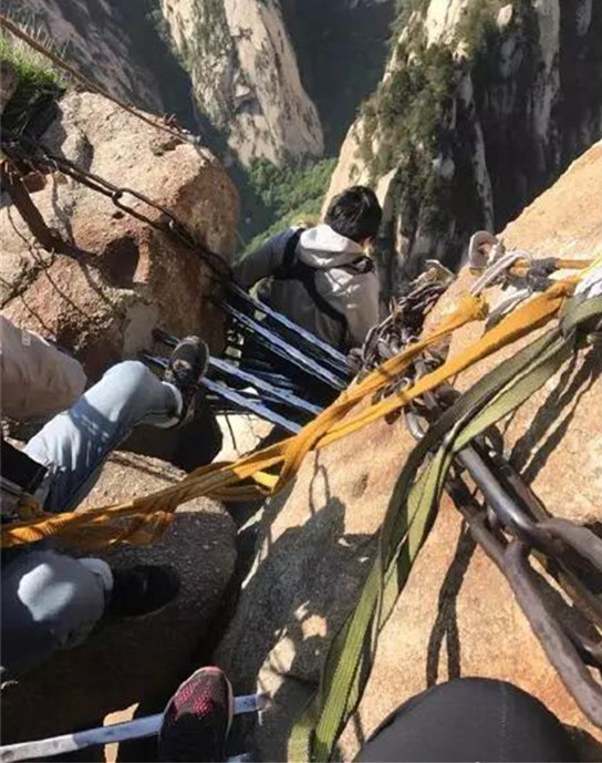 鷂子翻身:這條據(jù)說(shuō)坡度在120度的懸崖峭壁主要靠臂力,只能用手抓著鐵鏈,腳摸索著探路。人是從上往下攀緣,崖壁往里傾,從上往下望,只有云,只有山峰,什么都不見。這里的可怕在于你不知腳下的路,更無(wú)法預(yù)知危險(xiǎn),一不留神就會(huì)兩腳懸空,被保險(xiǎn)繩吊在空中。