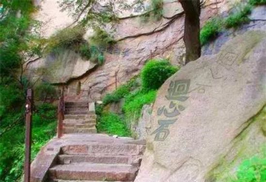 韓愈投書處:從北峰上行,過(guò)擦耳崖,爬天梯,就到了蒼龍嶺,這處地方就像它的名字一樣,仿佛是一條蒼龍用它的背脊架起了這條路,路面極之狹窄,若有人迎面擦肩而過(guò),最好大家互相背靠背遷就一下,免生危險(xiǎn)。蒼龍嶺的山脊上下高差約五百米,山坡傾斜度達(dá)45度,兩旁山谷,深不可測(cè),據(jù)說(shuō)唐代韓愈當(dāng)年上山到了此地,見山高勢(shì)險(xiǎn),以為自己必死無(wú)疑,于是寫下遺書,投往山下,所以大家會(huì)發(fā)現(xiàn)路旁一塊巨石之上,寫有“韓愈投書處”的字樣。
