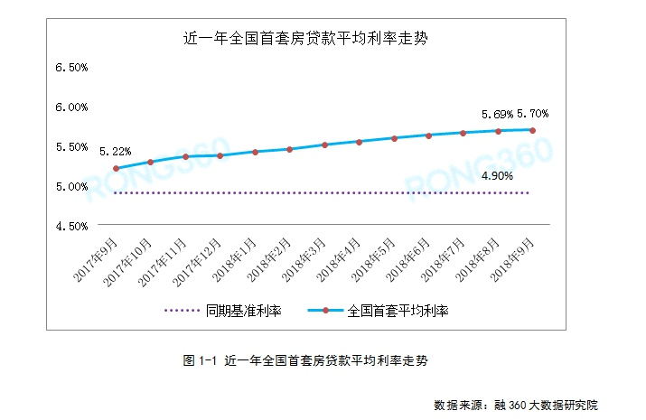 融360監(jiān)測數據顯示,2018年9月全國首套房貸款平均利率為5.70%,環(huán)比小幅上升0.18%,同比去年9月5.22%的利率上升9.20%。