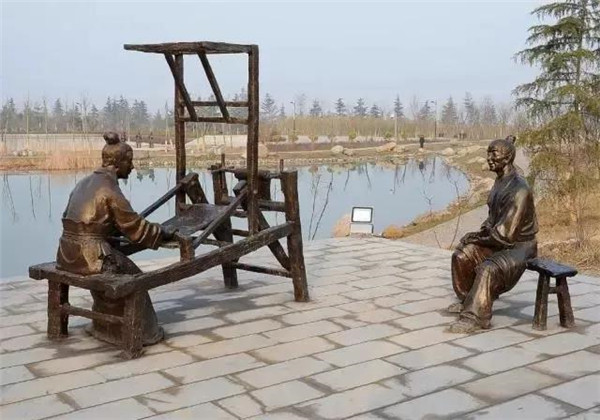 董永,相傳為東漢時(shí)期千乘人,年少喪母,因避兵亂遷居安陸。其后父親亡故,董永賣身至一富家為奴,換取喪葬費(fèi)用。上工路上,于槐蔭下遇一女子,自言無家可歸,二人結(jié)為夫婦。女子以一月時(shí)間織成三百匹錦緞,為董永抵債贖身,返家途中,行至槐蔭,女子告訴董永:自己是天帝之女,奉命幫助董永還債。言畢凌空而去。因此,槐蔭改名為孝感。