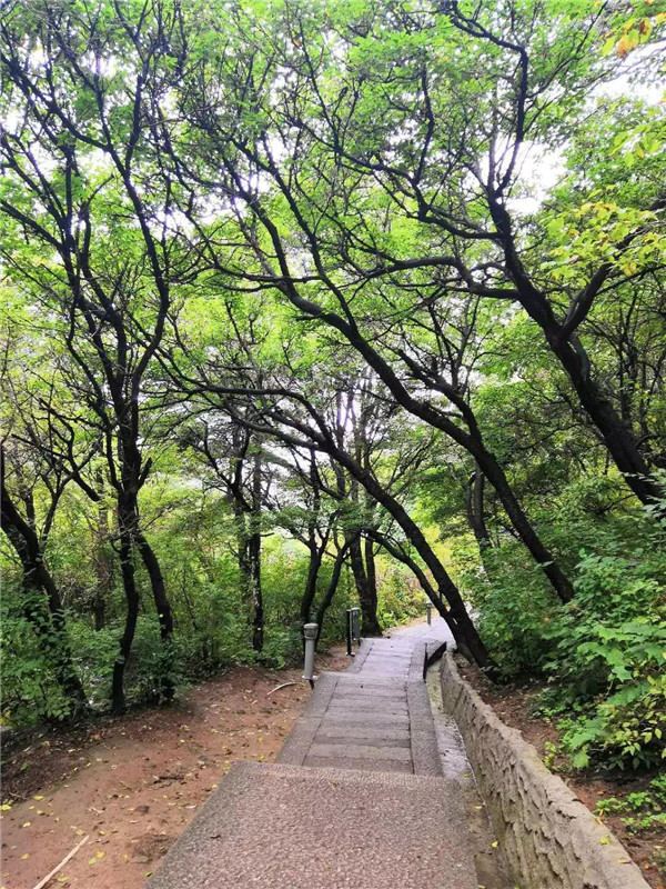 清晨,陽光穿過樹林灑在石階上,斑駁的光影隨風(fēng)自在地?fù)u晃。茂密的樹林蒸騰起無數(shù)看不見的水汽,溫潤(rùn)的撲在臉上,令人心曠神怡。
