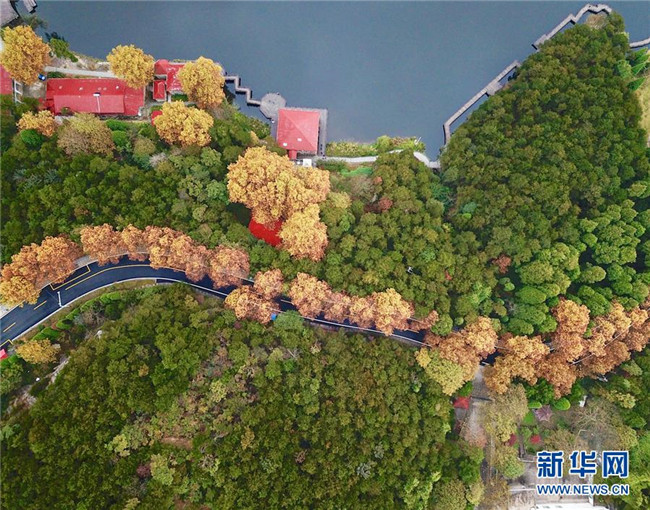 這是如琴湖旁公路的秋色風(fēng)光(10月20日無(wú)人機(jī)拍攝)。 新華社記者 胡晨歡 攝