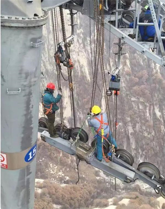 站在支架頂上,迪冰瑤用雙手將100斤重的導(dǎo)鏈吃力地舉過(guò)頭頂安裝固定好,然后開始校正鋼索。