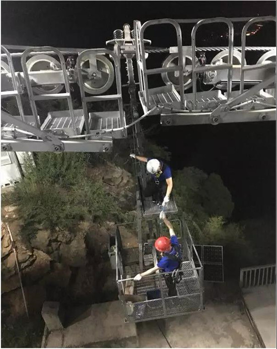 每年的五一和十一是景區(qū)游客最多的時(shí)候,也是索道維護(hù)工最忙的時(shí)候。除了正常巡線外,維護(hù)工還要分出一部分人到每個(gè)支架下面固定值守。有一年送完游客后剛準(zhǔn)備撤離時(shí),山上突然刮起了大風(fēng),索道保護(hù)性停車,值守在支架下的維護(hù)工們就在野外呆了一夜。山上夜晚的風(fēng)特別大,感覺能把人連帳篷吹到溝里去。那一夜,巨文躲進(jìn)套在支架爬梯外邊的鐵皮護(hù)筒里,蜷縮著熬過(guò)了一個(gè)漫長(zhǎng)的夜晚。