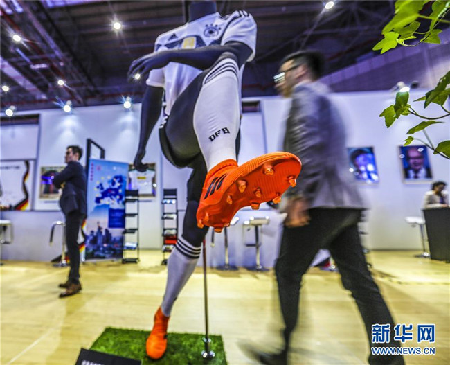 11月6日,參觀者從首屆中國國際進口博覽會德國展區(qū)的德國足球國家隊2018年球衣展品旁走過。新華社記者殷剛攝