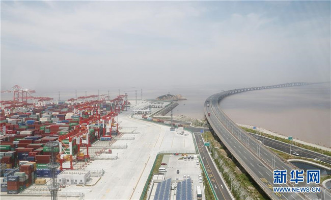 從洋山深水港四期無人碼頭控制塔上俯瞰碼頭集裝箱堆場(chǎng)(5月17日攝)。新華社記者方喆攝