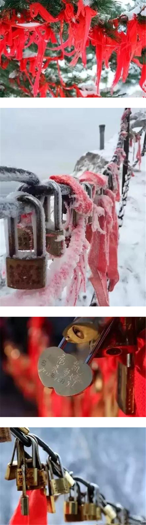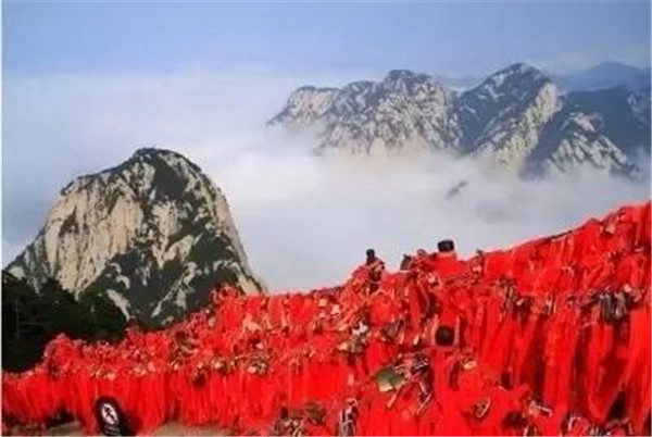 當山風徐徐吹來,長長的紅色絲繩就會隨風輕盈的舞蹈起來,如輕盈的飛鳥,比翼雙飛將愛情的甜蜜帶到華山的每一個角落,將愛情的誓言印刻在每一塊充滿靈性的石頭上。